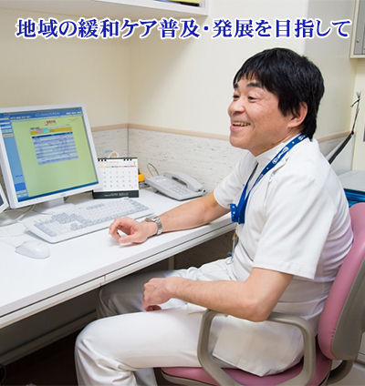 緩和ケア内科では、緩和ケア病棟を中心に、緩和ケア専門外来、院内緩和ケアチームで診療を行い、がん患者さんが望む場所で療養できるよう、他のがん診療連携拠点病院や一般病院、在宅療養支援診療所と連携し、切れ目ない緩和ケアの提供を行っています。
