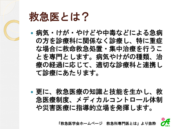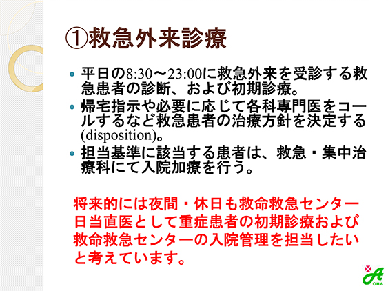 また、救急医療の向上のため、医師・看護師・救急救命士やその学生の教育という役割を担っています。